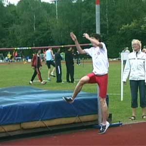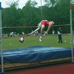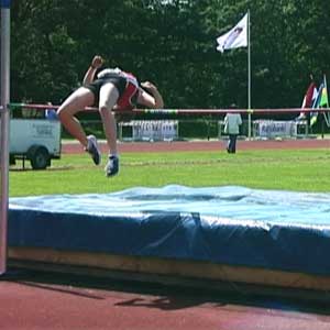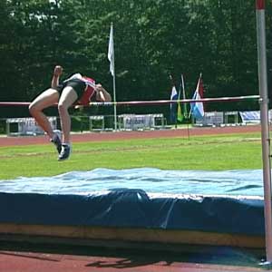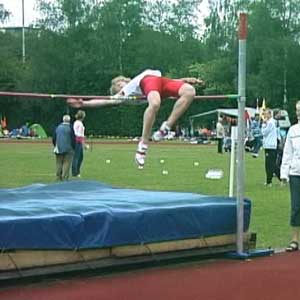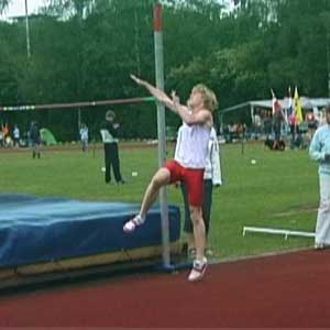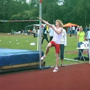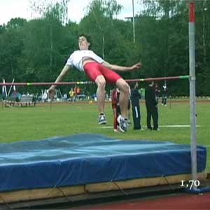 Erik op 1,80 en op 1,85 (PR). Net als bij Marije hierboven is de sprong op de hoogste hoogte een heel klein beetje minder van techniek. Op het hoogste punt zitten de schouders iets lager dan de heupen, prima, en ook heel mooi is hoe de rechterarm enigszins naar de grond wijst. Om nog net iets meer rotatie te krijgen kan de knie bij de afzet nog wat hoger, maar veel is het niet. Knie wijst heel mooi van de lat af. BochtDe houding in de bocht is OK, mooie bocht. Op het filmpje zie je dat Erik eerst een scherpe bocht loopt en veel naar binnen hangt en dan de laatste paar passen iets minder. Dat scherpe deel van de bocht kan wat slapper gemaakt worden (paar voetjes naar rechts), maar de laatste passen moeten wel exact hetzelfde blijven. Die aanpassing hebben we dan ook gedaan. (Als iemand hoger springt mag de bocht slapper zijn omdat je dan toch langer in de lucht bent en toch wel voldoende gaat roteren.)Armen en benenOp het hoogste punt van de sprong is het het gunstigs als de onderbenen recht naar beneden wijzen. Over de actie van de binnenste arm zijn er veel opvattingen. Sommigen strekken die arm recht omhoog, anderen, zoals Erik, schuin omhoog, weer anderen laten de hand hooguit tot neushoogte komen. Het omhoog strekken doen sommigen al bij het begin van de laatste pas, sommigen doen het tijdens de zweeffase van de laatste pas en weer anderen doen het tijdens de afzet. Het lijkt allemaal niet wezenlijk uit te maken. Ik houd het er op dat het pas nuttig kan zijn vanaf 2,10 meter! Dus als je zo hoog gaat springen begin ik er over. Trouwens, wel is het mooi als die arm na passage van de lat ongeveer richting voeten wijst. Of in elk geval niet naar de wolken... |