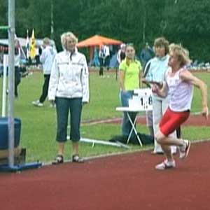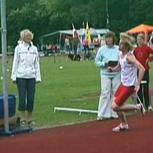 Een goede aanloop bestaat uit een stuk rechte lijn gevolgd door een mooi erop aansluitend stuk van een cirkel. Ook het laatste stuk van de aanloop is nog cirkelvormig, pas tijdens de laatste pas kom je van naar binnen hangen tot verticaal. Bij het laatste stukje van de afzet ben je dus verticaal, ga niet naar de lat toehangen.De aanloop moet zo snel dat je het hoogste springt. Nogal wiedus. Maar hoe snel is dat? Dat is niet voor iedereen hetzelfde, maar voor zeer veel springers geldt dat de aanloop best wat sneller zou kunnen. Je moet zo snel gaan dat je de snelheid op kunt vangen (en dan niet alleen bij je eerste sprong, maar ook bij de laatste sprong van de wedstrijd). Mensen met veel aanleg voor het hoogspringen, dus met veel sprongkracht, hebben de neiging langzaam te lopen en dan pats heel sterk af te zetten. Toch springen ook zij hoger met een snellere aanloop. Je been werkt dan een beetje als een polsstok en bij polsstospringen geldt: hoe snellere aanloop hoe hoger de sprong. Ik zeg niet veel over hoe je moet aanlopen. Met grote passen, lage passen, korte passen, springerige passen, versnellend of vertragend? Eigenlijk maakt het weinig uit -- als de laatste pas maar perfect is: fel en goed en precies snel genoeg. Soms zie je hoogspringers die als een drol aanlopen, maar in de laatste pas doen ze toch ineens de juiste acties, dan geeft die drol niet zo (al zou ik het niet aanbevelen). Wel geldt natuurlijk voor alle atleten, dat je moet zorgen voor goede buik- en rugspieren, sterke enkels en voeten enzovoort enzovoort. (Meer over het berekenen/tekenen van een aanloop hier (tekst Engels).) DRIE PLAATJESIk kijk altijd eerst naar het moment dat je het hoogst boven de grond bent (voor wie van natuurkunde houdt: het is het moment waarop je zwaartepunt de top van de paraboolbaan passeert; hoogspringen is allemaal natuurkunde! Voor de doorbijters: zie onder.). In de lucht kan je weinig doen (behalve je rug hol trekken en je armen en benen een beetje zus of zo laten zwabberen) en wat je op het hoogste punt ziet is dan ook allemaal veroorzaakt bij de afzet en tijdens de laatste pas van de aanloop. Daarom geef ik eerst een beeldje van het hoogste punt, daarnaast een beeldje van het laatste moment van de afzet en dan nog een beeldje van het begin van de laatste pas van de aanloop. Bijna altijd weet je door die drie plaatjes al genoeg om een sprong te kunnen beoordelen en om in de training weer lekker aan de techniek te kunnen gaan werken.VOORBEELDEN/DETAILSHieronder zie je Marije op 1,60 en op 1,65 (PR). De sprong op de hoogste hoogte is een heel klein beetje minder van techniek. Dat heeft bijna iedereen, je ziet het ook heel vaak bij de OS en WK.De latpassage is heel erg goed. Kijk bij het hoogste punt naar de hoogte van de schouders en de hoogte van de heup en dan zie je dat de schouders lager zitten dan de heup, je bent dan heel goed om de lat heen gedraaid/geroteerd. Bovendien gooit Marije haar hoofd helemaal achterover en ook dat is prachtig, niet iedereen durft dat. RotatieDie rotatie (draaiing) om de lat heen wordt bij de afzet veroorzaakt door drie dingen. Eerst het zwaaibeen, dat is hier super: spitse knie, bovenbeen hoger dan horizontaal, been wijst van de lat af. Verder krijg je rotatie als je bij het begin van de laatste pas flink in de bocht hangt en dan in de laatste pas rechtop komt. Dat naar binnen hangen doet Marije niet heel erg, maar door die superknie is dat ook niet nodig. Rotatie komt ook nog een klein beetje door de 'banaan', dat is dat bij de afzet de heupen iets verder van de lat af zitten dan hoofd en afzetvoet, dat is hier wel enigszins te zien. |
