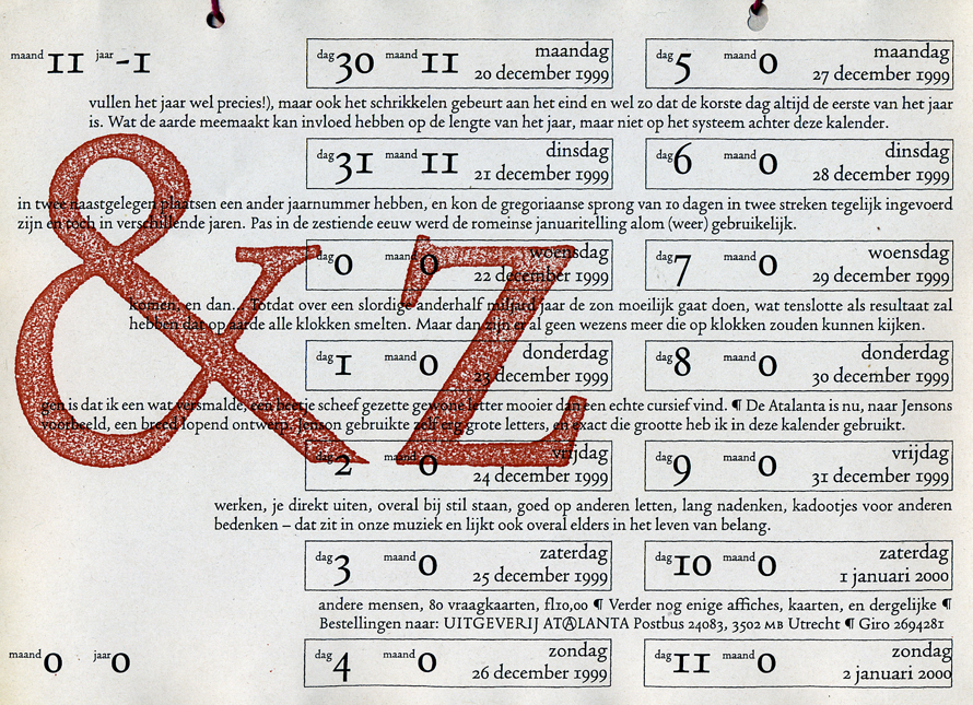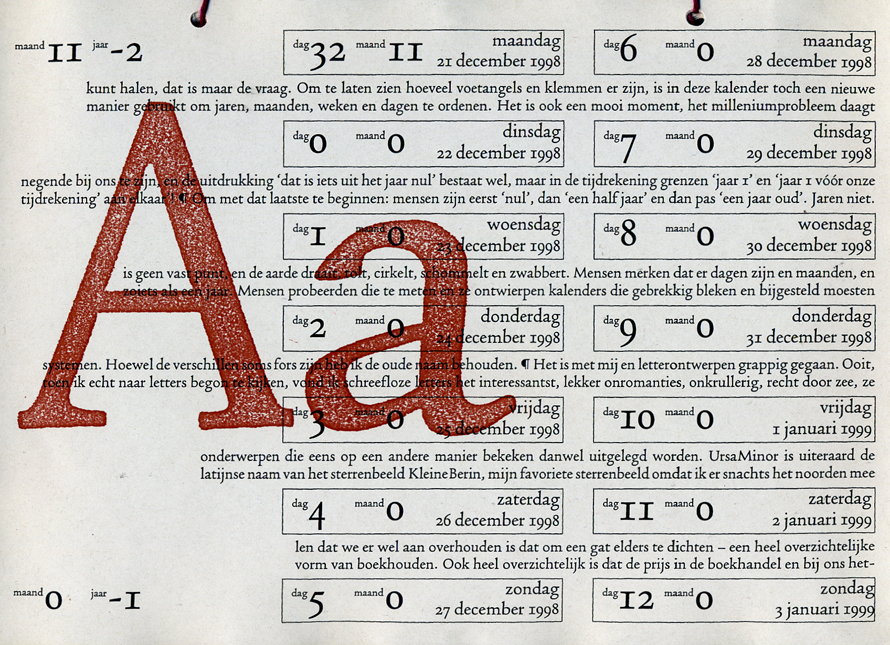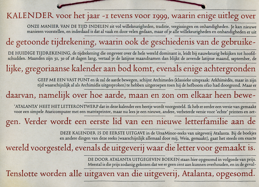 Ursa Minor 01. Eenmalige kalender om ons nieuwe font, de Atalanta, te laten zien, maar ook om van alles over onze tijdrekening te vertellen. En dus in een nieuw soort tijdrekening!