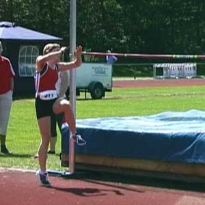 Erik op 1,80 en op 1,85 (PR). Net als bij Marije hierboven is de sprong op de hoogste hoogte een heel klein beetje minder van techniek. Op het hoogste punt zitten de schouders iets lager dan de heupen, prima, en ook heel mooi is hoe de rechterarm enigszins naar de grond wijst. Om nog net iets meer rotatie te krijgen kan de knie bij de afzet nog wat hoger, maar veel is het niet. Knie wijst heel mooi van de lat af. BochtDe houding in de bocht is OK, mooie bocht. Op het filmpje zie je dat Erik eerst een scherpe bocht loopt en veel naar binnen hangt en dan de laatste paar passen iets minder. Dat scherpe deel van de bocht kan wat slapper gemaakt worden (paar voetjes naar rechts), maar de laatste passen moeten wel exact hetzelfde blijven. Die aanpassing hebben we dan ook gedaan. (Als iemand hoger springt mag de bocht slapper zijn omdat je dan toch langer in de lucht bent en toch wel voldoende gaat roteren.)Armen en benenOp het hoogste punt van de sprong is het het gunstigs als de onderbenen recht naar beneden wijzen. Over de actie van de binnenste arm zijn er veel opvattingen. Sommigen strekken die arm recht omhoog, anderen, zoals Erik, schuin omhoog, weer anderen laten de hand hooguit tot neushoogte komen. Het omhoog strekken doen sommigen al bij het begin van de laatste pas, sommigen doen het tijdens de zweeffase van de laatste pas en weer anderen doen het tijdens de afzet. Het lijkt allemaal niet wezenlijk uit te maken. Ik houd het er op dat het pas nuttig kan zijn vanaf 2,10 meter! Dus als je zo hoog gaat springen begin ik er over. Trouwens, wel is het mooi als die arm na passage van de lat ongeveer richting voeten wijst. Of in elk geval niet naar de wolken... |