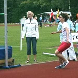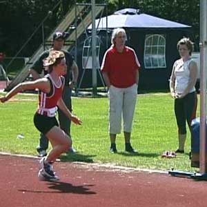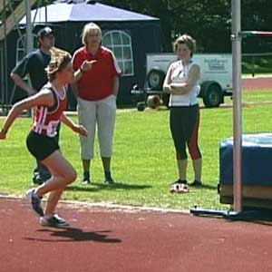 Een goede aanloop bestaat uit een stuk rechte lijn gevolgd door een mooi erop aansluitend stuk van een cirkel. Ook het laatste stuk van de aanloop is nog cirkelvormig, pas tijdens de laatste pas kom je van naar binnen hangen tot verticaal. Bij het laatste stukje van de afzet ben je dus verticaal, ga niet naar de lat toehangen.De aanloop moet zo snel dat je het hoogste springt. Nogal wiedus. Maar hoe snel is dat? Dat is niet voor iedereen hetzelfde, maar voor zeer veel springers geldt dat de aanloop best wat sneller zou kunnen. Je moet zo snel gaan dat je de snelheid op kunt vangen (en dan niet alleen bij je eerste sprong, maar ook bij de laatste sprong van de wedstrijd). Mensen met veel aanleg voor het hoogspringen, dus met veel sprongkracht, hebben de neiging langzaam te lopen en dan pats heel sterk af te zetten. Toch springen ook zij hoger met een snellere aanloop. Je been werkt dan een beetje als een polsstok en bij polsstospringen geldt: hoe snellere aanloop hoe hoger de sprong. Ik zeg niet veel over hoe je moet aanlopen. Met grote passen, lage passen, korte passen, springerige passen, versnellend of vertragend? Eigenlijk maakt het weinig uit -- als de laatste pas maar perfect is: fel en goed en precies snel genoeg. Soms zie je hoogspringers die als een drol aanlopen, maar in de laatste pas doen ze toch ineens de juiste acties, dan geeft die drol niet zo (al zou ik het niet aanbevelen). Wel geldt natuurlijk voor alle atleten, dat je moet zorgen voor goede buik- en rugspieren, sterke enkels en voeten enzovoort enzovoort. (Meer over het berekenen/tekenen van een aanloop hier (tekst Engels).) DRIE PLAATJESIk kijk altijd eerst naar het moment dat je het hoogst boven de grond bent (voor wie van natuurkunde houdt: het is het moment waarop je zwaartepunt de top van de paraboolbaan passeert; hoogspringen is allemaal natuurkunde! Voor de doorbijters: zie onder.). In de lucht kan je weinig doen (behalve je rug hol trekken en je armen en benen een beetje zus of zo laten zwabberen) en wat je op het hoogste punt ziet is dan ook allemaal veroorzaakt bij de afzet en tijdens de laatste pas van de aanloop. Daarom geef ik eerst een beeldje van het hoogste punt, daarnaast een beeldje van het laatste moment van de afzet en dan nog een beeldje van het begin van de laatste pas van de aanloop. Bijna altijd weet je door die drie plaatjes al genoeg om een sprong te kunnen beoordelen en om in de training weer lekker aan de techniek te kunnen gaan werken.VOORBEELDEN/DETAILSHieronder zie je Marije op 1,60 en op 1,65 (PR). De sprong op de hoogste hoogte is een heel klein beetje minder van techniek. Dat heeft bijna iedereen, je ziet het ook heel vaak bij de OS en WK.De latpassage is heel erg goed. Kijk bij het hoogste punt naar de hoogte van de schouders en de hoogte van de heup en dan zie je dat de schouders lager zitten dan de heup, je bent dan heel goed om de lat heen gedraaid/geroteerd. Bovendien gooit Marije haar hoofd helemaal achterover en ook dat is prachtig, niet iedereen durft dat. RotatieDie rotatie (draaiing) om de lat heen wordt bij de afzet veroorzaakt door drie dingen. Eerst het zwaaibeen, dat is hier super: spitse knie, bovenbeen hoger dan horizontaal, been wijst van de lat af. Verder krijg je rotatie als je bij het begin van de laatste pas flink in de bocht hangt en dan in de laatste pas rechtop komt. Dat naar binnen hangen doet Marije niet heel erg, maar door die superknie is dat ook niet nodig. Rotatie komt ook nog een klein beetje door de 'banaan', dat is dat bij de afzet de heupen iets verder van de lat af zitten dan hoofd en afzetvoet, dat is hier wel enigszins te zien. |